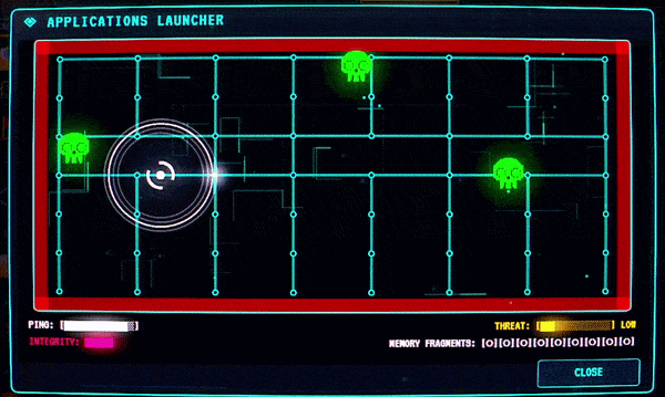 Run Ghostrunner (network trace-grid puzzle), NodeCrasher (incremental mini-game), Signal Scanner (radio signal capture and trading), and more to earn credits and faction standing.